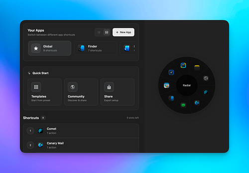 I spent the afternoon experimenting with Radial 4, a rapidly evolving pie-menu app from independent developer Gustav Lubker of AppVerge. If you’re not familiar with pie menu apps, they present a circular menu divided into sections (or slices), each representing an action or command. When configured well, they map naturally to muscle memory and can be extremely fast to use. Other pie-menu apps I've used include: • Pieoneer (good) • CirMenu (good) • PieMenu (limited) • Kando (FOSS) InterfaceIn Radial, pie menus can include the following types of actions: • Input • • Keyboard Shortcut • Text • Clipboard • Open...