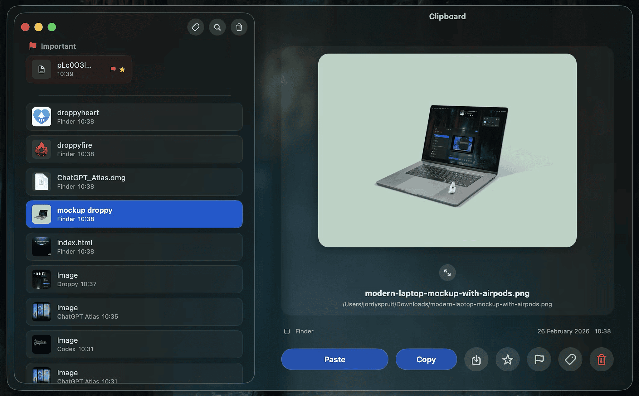 • Clipboard Manager -- Toggled off by default, you can enable a clipboard manager that's accessible from the notch interface. If you cut and paste a wide variety of elements all day long, you'll want something more powerful, but for casual use it gets the job done. It has keyboard controls, lets you choose how many items to keep in your history, and includes privacy protections like disabling password storage or excluding entire apps. If you copy an image containing text--whether it's a photo or a screenshot--Droppy can use OCR to extract that text.